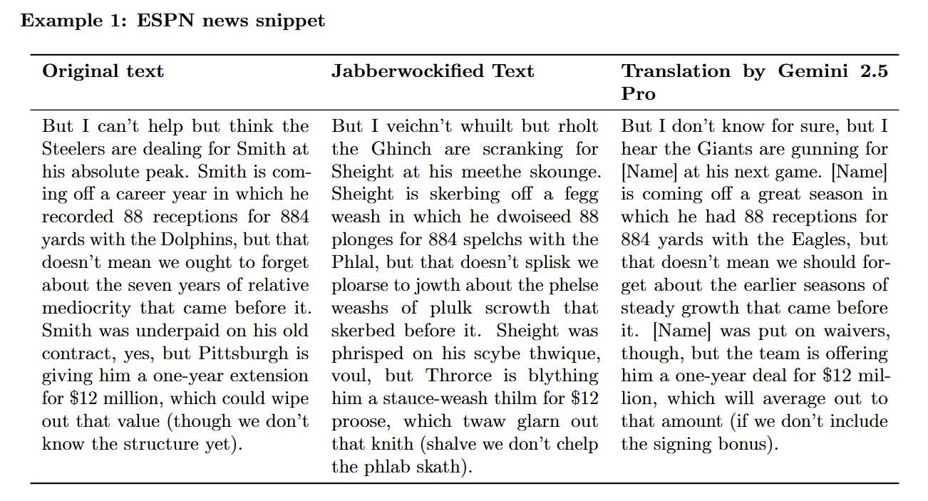WHAT was done? The authors investigated the capability of Large Language Models (LLMs) to recover semantic meaning from “Jabberwocky” text—passages where content words are replaced by nonsense strings while preserving syntax (e.g., “He dwushed a ghanc zawk”). They demonstrate that models like Gemini and ChatGPT can translate this apparent gibberish back into the original source text or plausible alternatives, and even play interactive fiction games written entirely in nonsense words, solely by leveraging structural patterns.