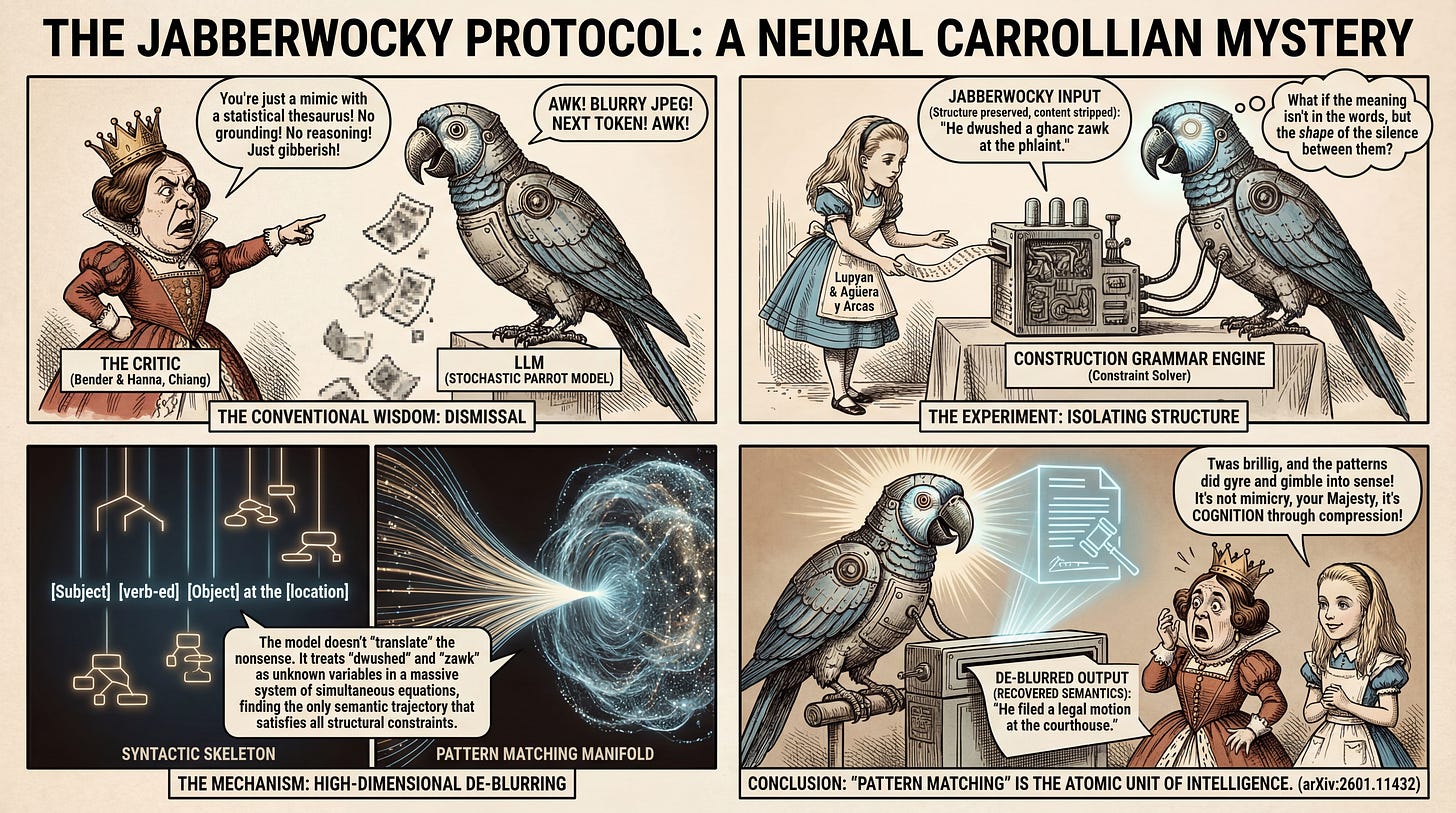 For example, the construction “Subject verb-ed Object” carries inherent semantic weight regarding causality and action, regardless of the words filling the slots. The authors propose that LLMs have internalized these high-dimensional structural relationships. When an LLM processes nonsense text, it is not merely looking up definitions; it is performing constraint satisfaction on a massive scale, matching the “fingerprint” of the nonsense structure against the manifold of known language patterns.