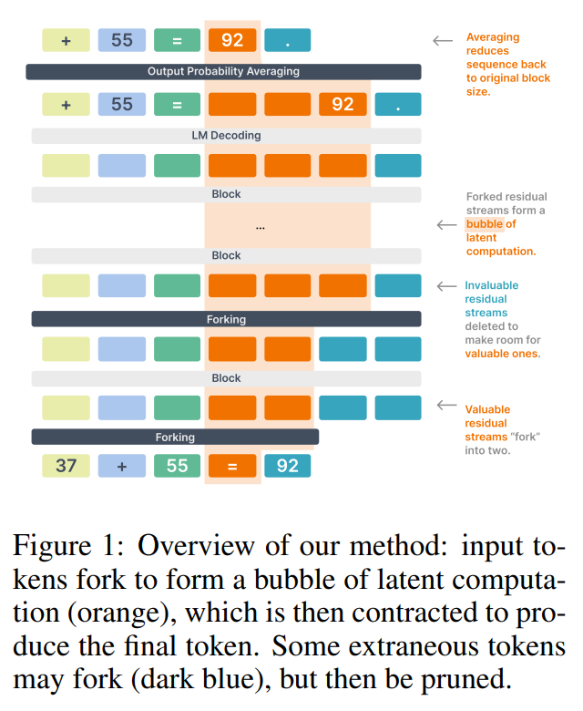 WHAT was done? The paper introduces Thoughtbubbles, a novel Transformer architecture that learns to dynamically allocate parallel computation in its latent space. Instead of generating explicit text like in Chain-of-Thought, this model can “fork” (clone) or “delete” the latent residual streams of specific tokens. Tokens that require more processing form temporary “bubbles” of parallel computation within the network, which are later merged to produce a final output (Figure 1).