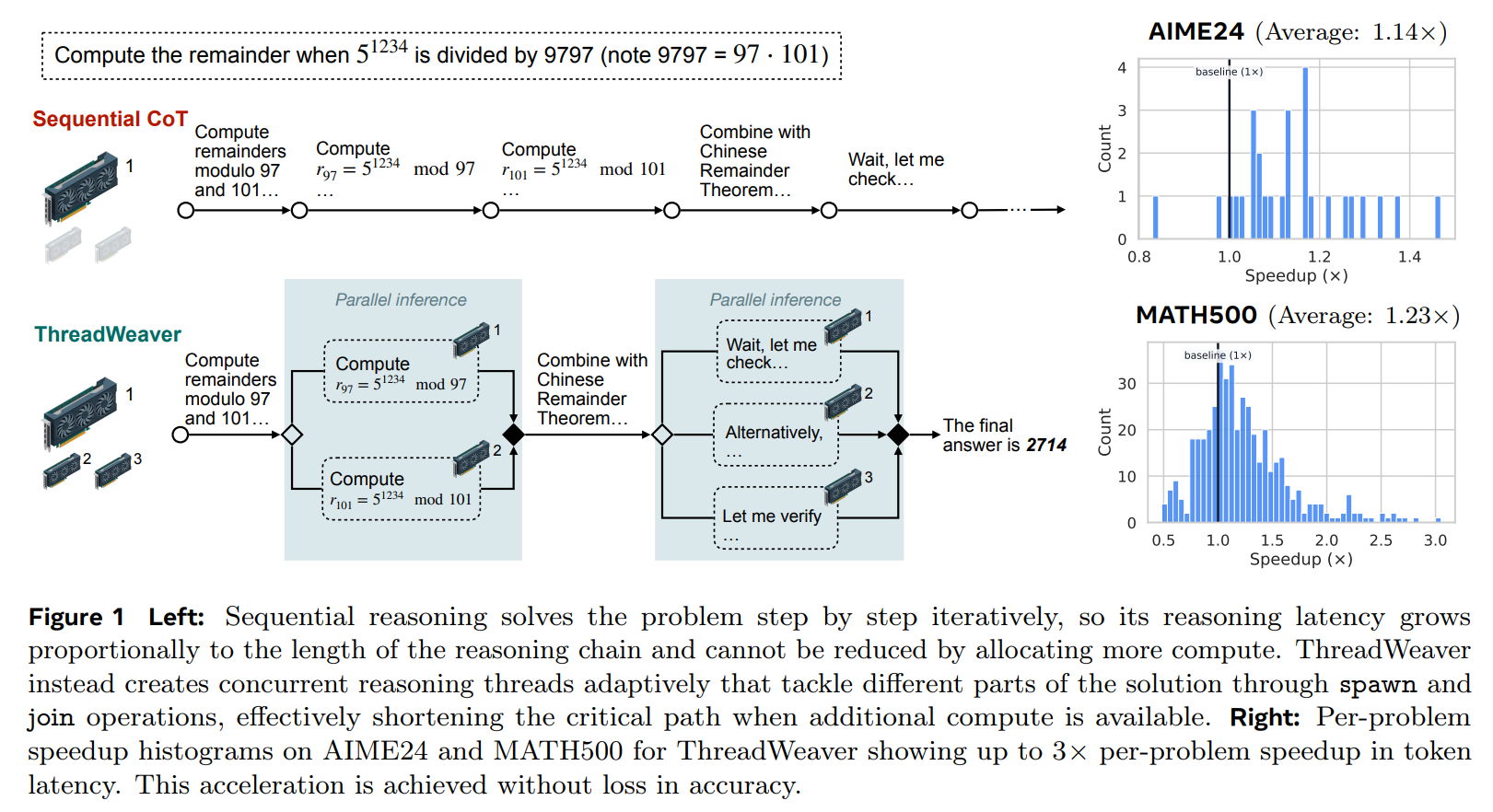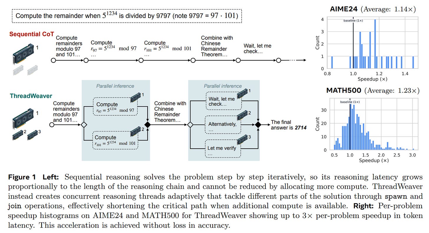 The current paradigm for advanced reasoning relies heavily on test-time compute scaling, where models generate extensive Chain-of-Thought (CoT) sequences to navigate complex problem spaces. However, autoregressive decoding imposes a rigid sequential constraint: a reasoning trace that requires 10,000 tokens incurs a latency penalty proportional to 10,000 steps, regardless of the available compute capacity. While techniques like Skeleton-of-Thought or Tree of Thoughts attempt to introduce parallelism, they often rely on static heuristics or result in significant performance degradation compared to sequential baselines. Recent adaptive approaches, such as Multiverse, have struggled to balance the trade-off, often sacrificing reasoning accuracy for parallelism. ThreadWeaver addresses this specific “Pareto inefficiency” by learning to parallelize adaptively—forking only when the problem structure permits—thereby utilizing abundant parallel compute to reduce wall-clock time without degrading the logical coherence of the solution.