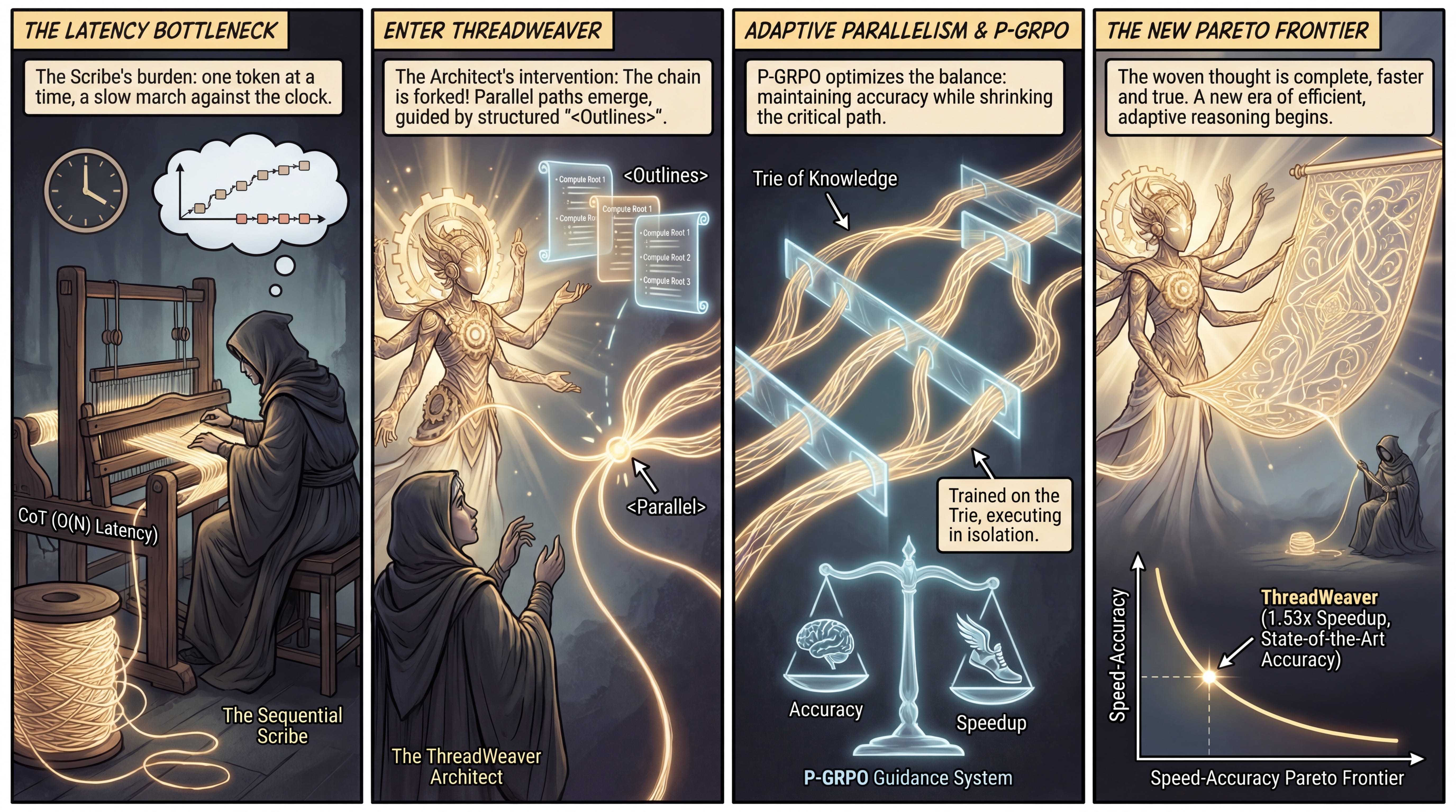 WHAT was done? The authors introduce ThreadWeaver, a framework that enables Large Language Models (LLMs) to dynamically break sequential Chain-of-Thought (CoT) reasoning into concurrent threads. By training the model to output specific control tokens (<Parallel>, <Thread>) and leveraging a trie-based attention mechanism during training, the system allows for “fork-join” execution patterns. They further refine this behavior using a modified reinforcement learning algorithm, P-GRPO, which optimizes for both answer correctness and reduced critical path length.
