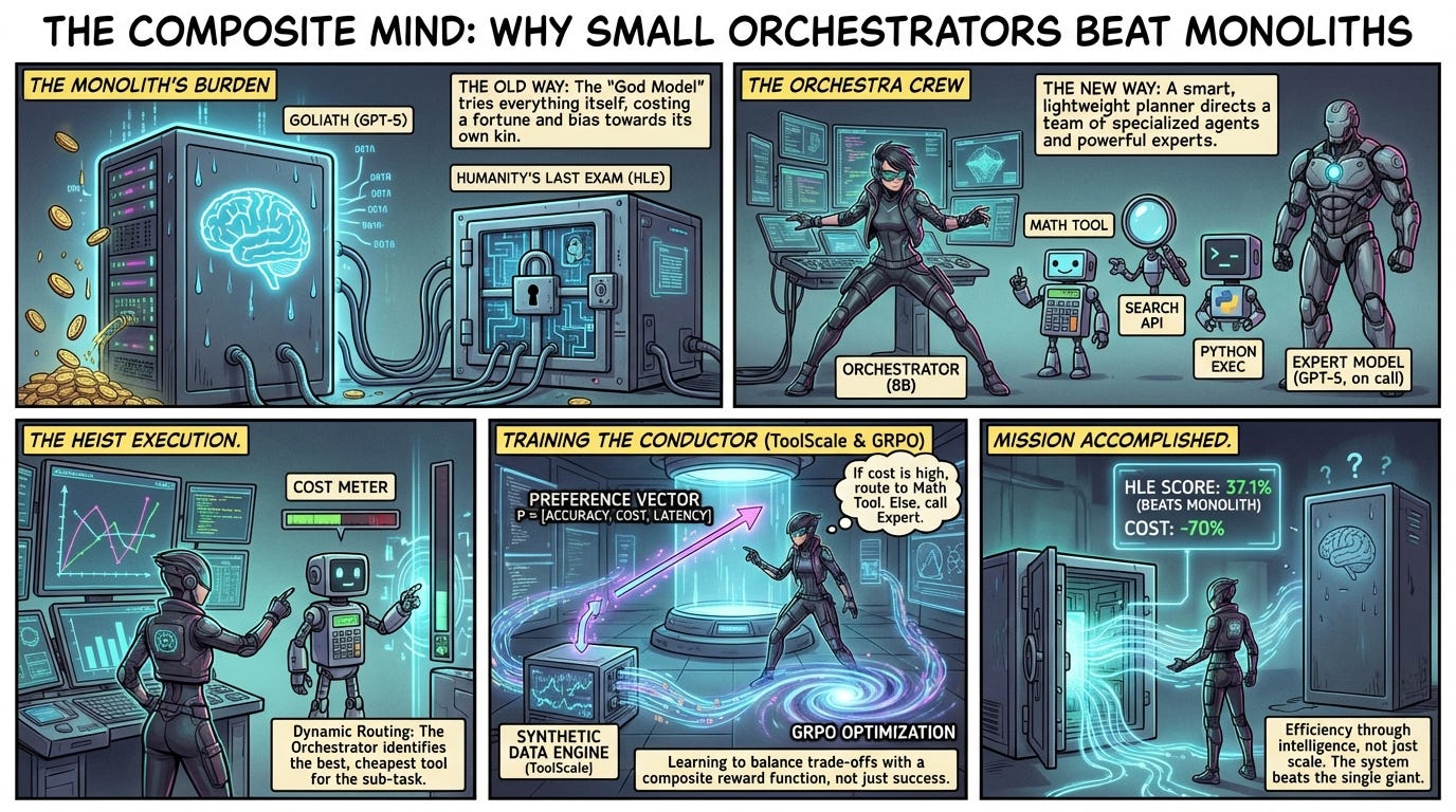 WHY it matters? This research challenges the “monolithic” scaling hypothesis by demonstrating that an 8B model, when properly trained to coordinate external resources, can outperform frontier models like GPT-5 on complex benchmarks like Humanity’s Last Exam (HLE) while reducing inference costs by roughly 70%. It validates the strategic shift from single giant models to compound AI systems where intelligence emerges from orchestration rather than parameter count.