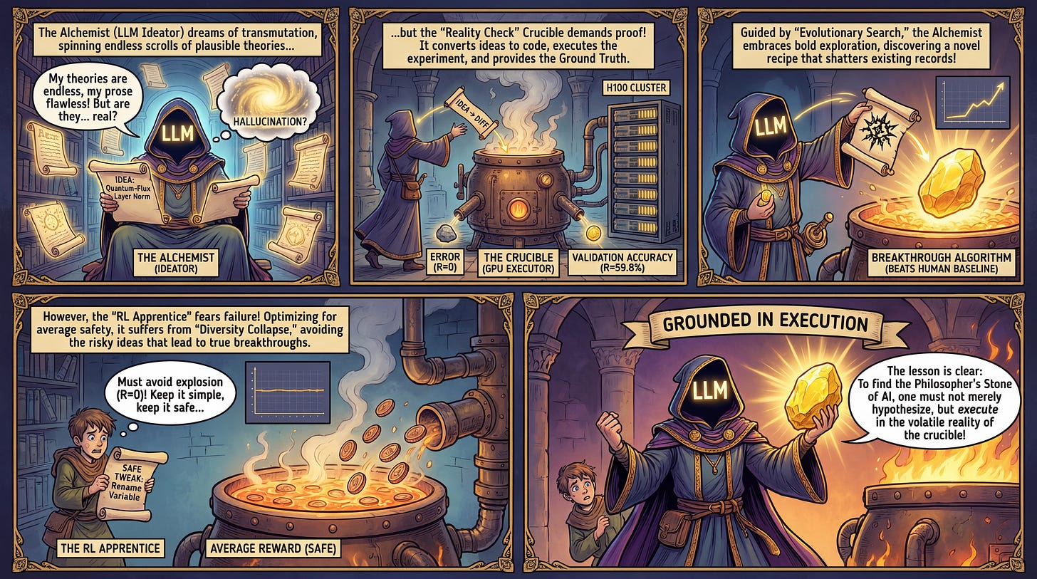 WHY it matters? This work addresses the “hallucination bottleneck” in automated science, where agents generate plausible-sounding but functionally useless ideas. By closing the loop with actual execution, the authors demonstrate that LLMs can discover novel algorithms that outperform strong baselines (e.g., beating the best human performance on a specific GRPO task). Crucially, the paper reveals a counter-intuitive divergence in learning dynamics: while evolutionary search effectively discovers outliers, RL tends to suffer from mode collapse, optimizing for “safe,” simple code changes rather than scientific breakthroughs.