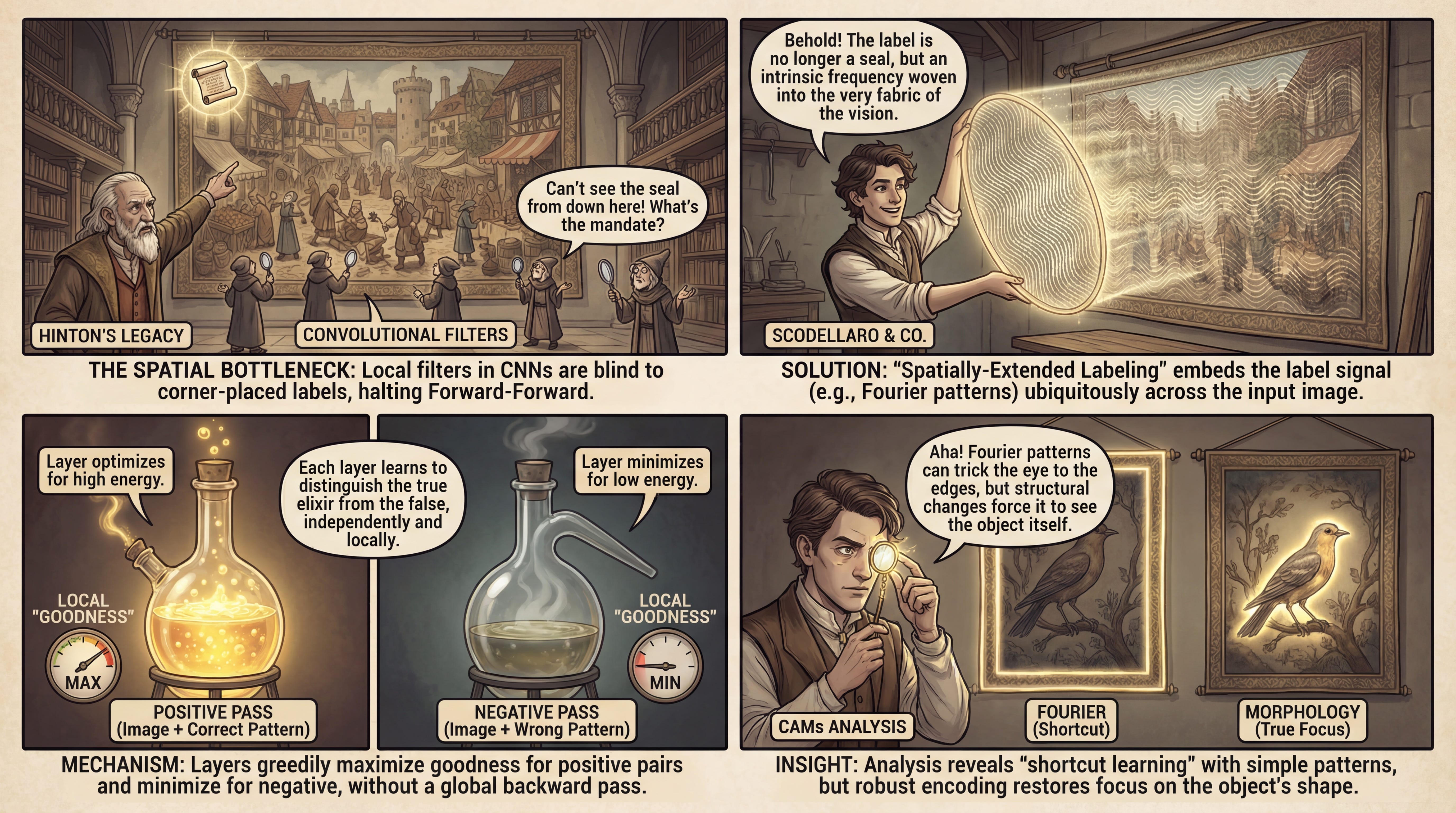 WHAT was done? The authors successfully extended Geoffrey Hinton’s Forward-Forward (FF) algorithm—originally restricted to fully connected networks—to Convolutional Neural Networks (CNNs). They achieved this by introducing “spatially-extended labeling,” a technique that superimposes label information (via Fourier patterns or morphological distortions) across the entire input image, allowing convolutional filters to access label data locally at any spatial position.