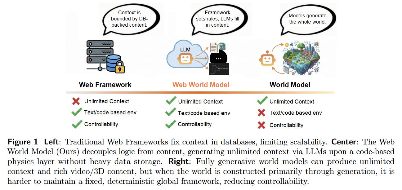 The central tension in modern agentic environment design lies between consistency and scale. Traditional web frameworks offer robust state management and determinism via databases (e.g., SQL), but the world size is strictly bounded by stored data. Conversely, fully generative approaches—such as Generative Agents (see review) or learned simulators like WebDreamer—promise infinite context but suffer from “dream-like” instability, where object permanence dissolves and physical rules drift. The authors identify that current approaches force a choice: a small, reliable world or an infinite, unreliable one. The Web World Model (WWM) proposes that we do not need to choose if we architecturally separate the rules of the world from its content.
