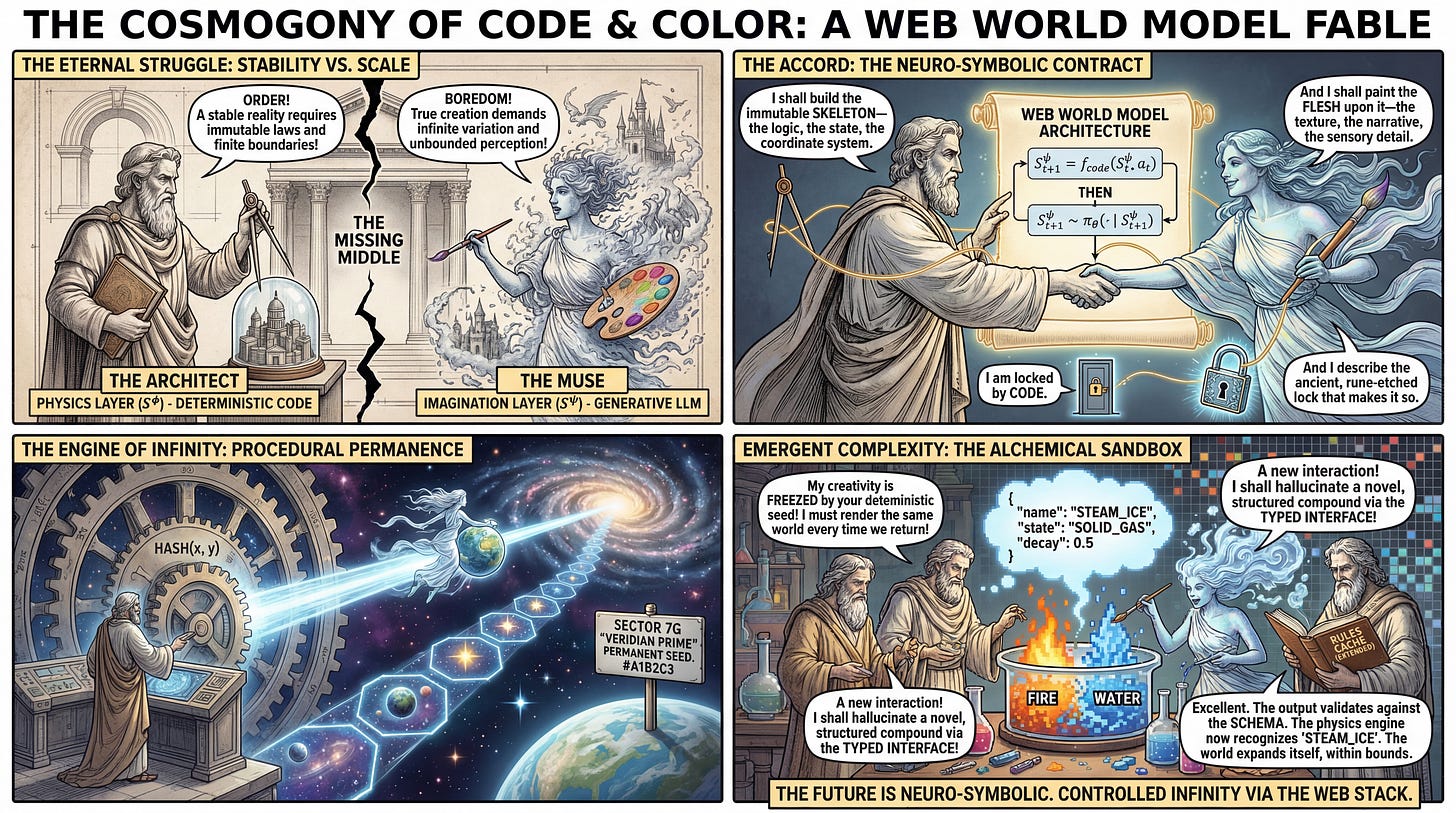 WHY it matters? This work addresses the “missing middle” between rigid, finite web applications and uncontrollable, fully generative world models (like World Models). By treating the modern web stack as a neuro-symbolic substrate, it offers a practical blueprint for deploying long-running, hallucination-free agents that can explore infinite state spaces while retaining the structural guarantees required for game mechanics and software reliability.